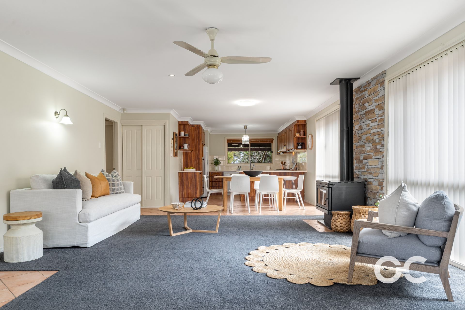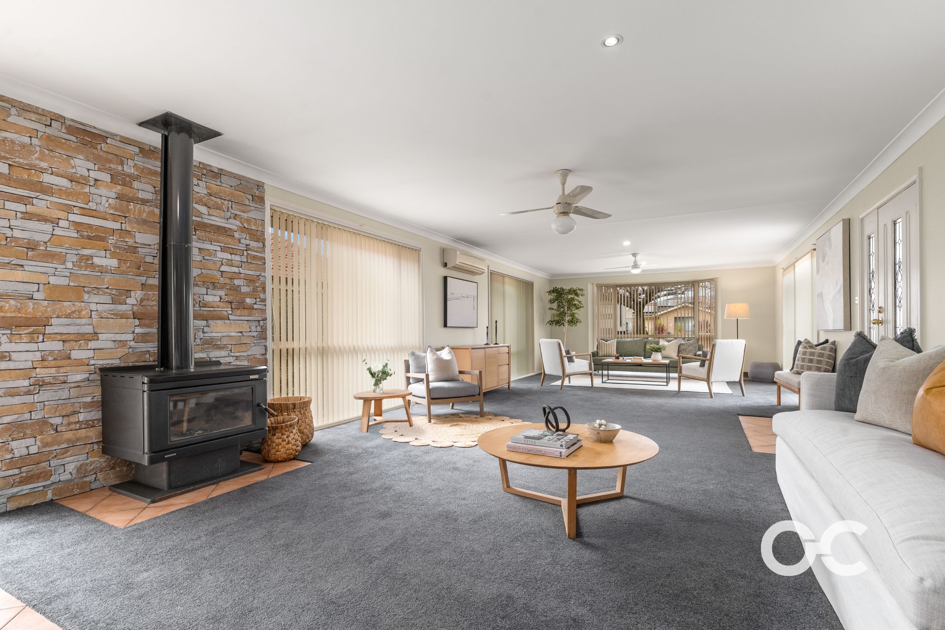 - Split system for heating and cooling plus a wood fireplace and ceiling fans