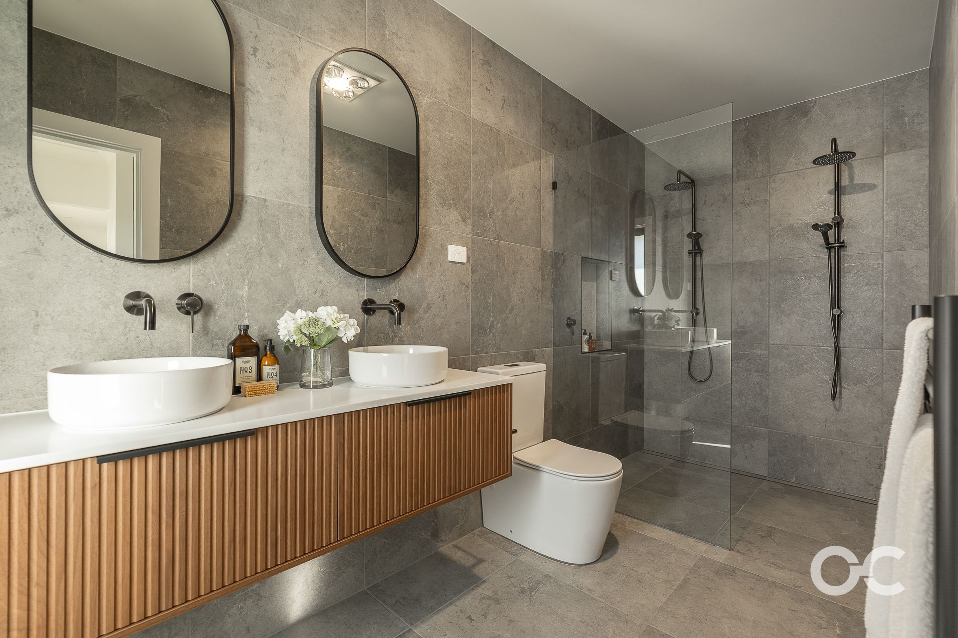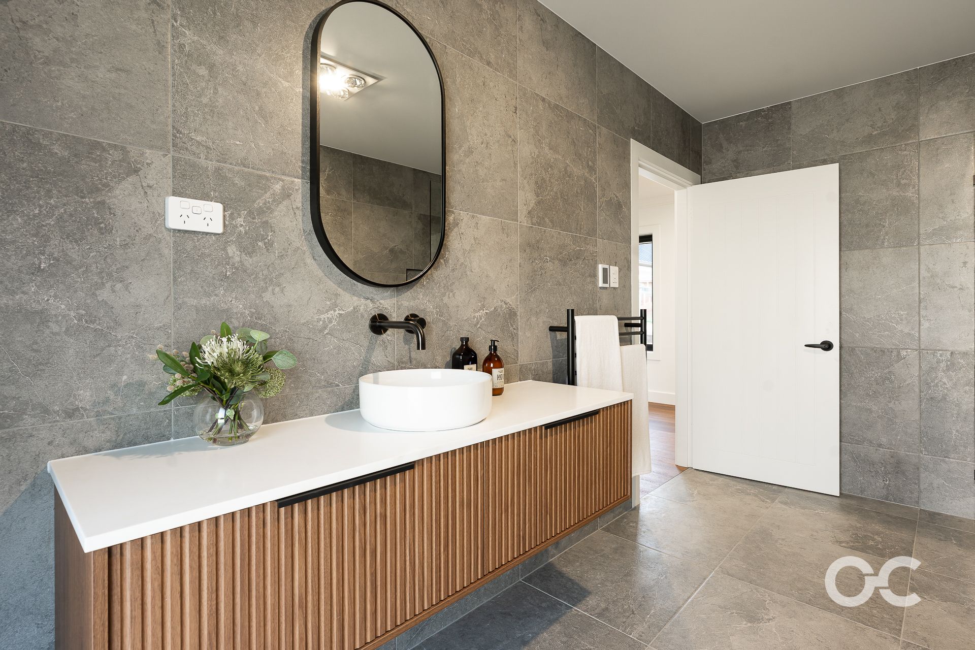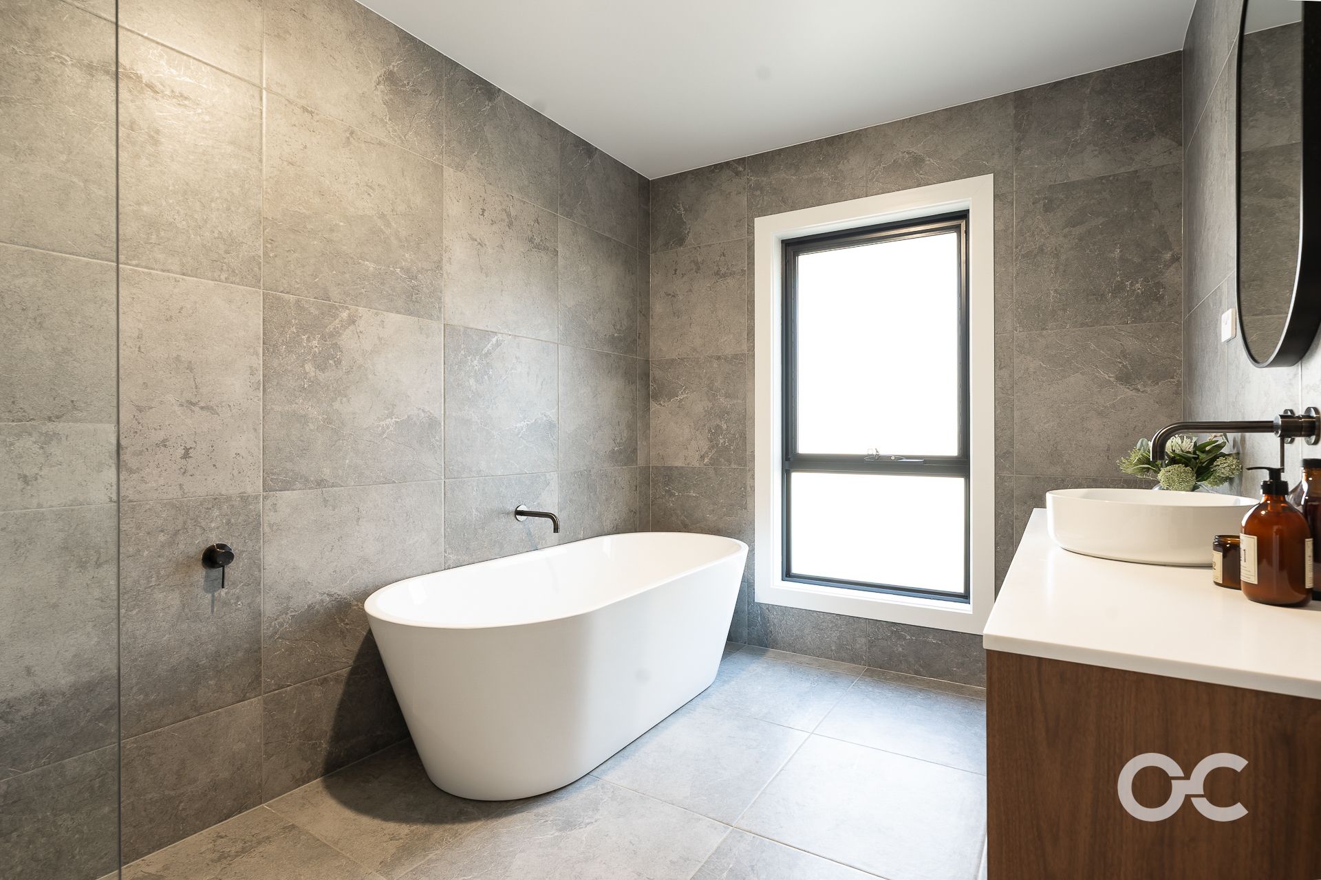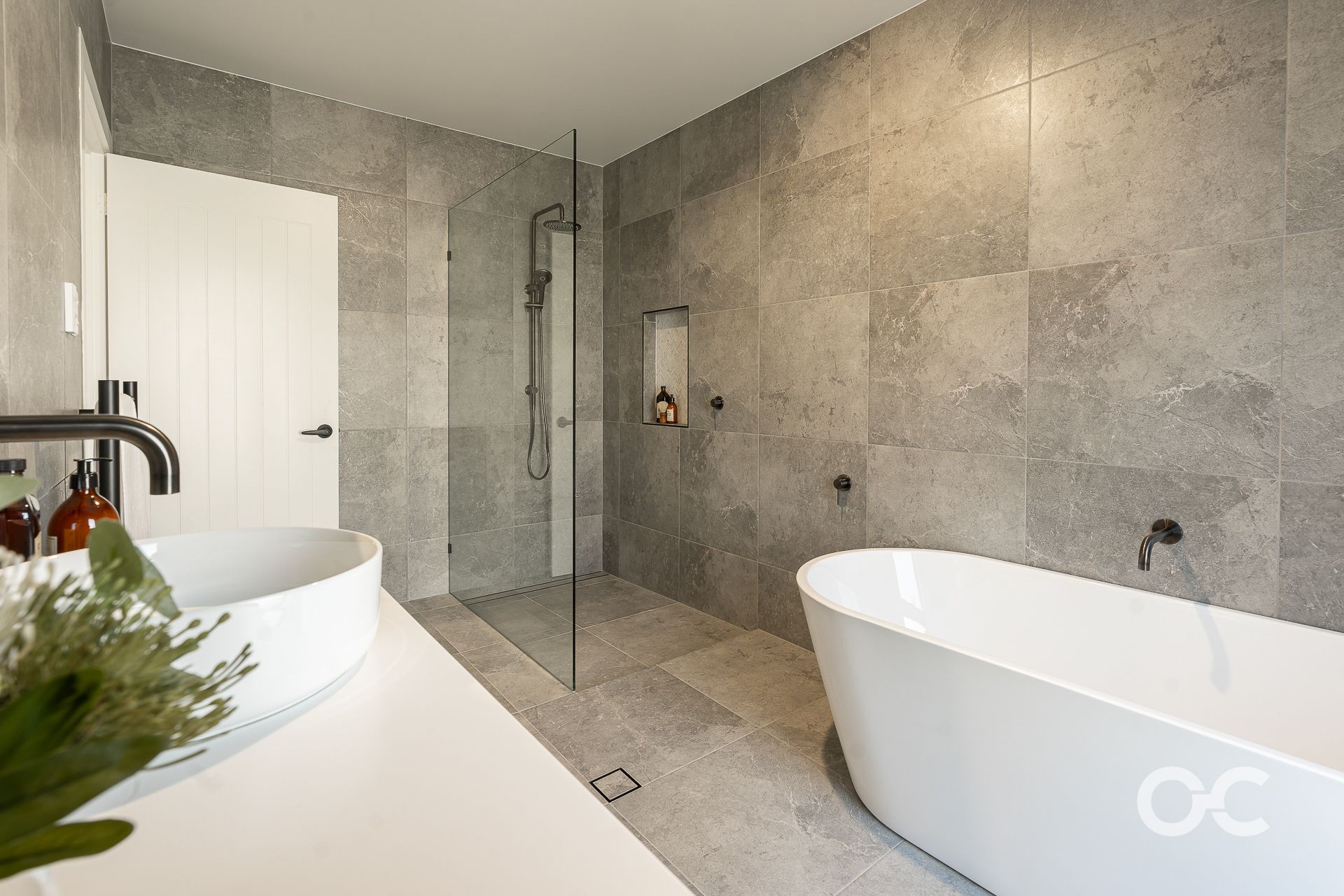 - Sophisticated main bathroom with modern floor-to-ceiling tiles